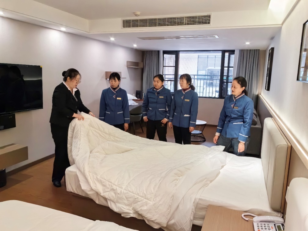 在实操教学中,杨勤老师采用“随做随问、即学即改”的互动模式,重点对卫生间毛巾叠放、床上用品整理、室内物品摆放等服务流程进行了示范操作,针对实训指导师在实际工作中遇到的难题,给予了专业解答和针对性建议。同时,对实训指导师展示的操作流程,进行了专业指导,破解了日常工作中的盲区,增强了实训指导师的服务意识和实操能力。