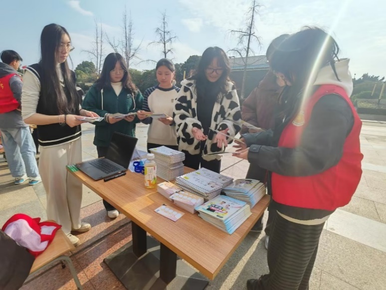 活动中,学生志愿者向参与活动的同学发放内容全面的健康宣传手册,并通过面对面的简短交流与解答将一份份宣传单化作温暖的提醒和科学的指引,让健康知识的传递更具温暖与实效。