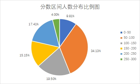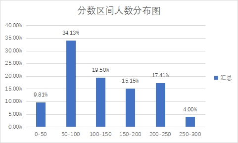 本次测试最高分287分,最低分1分,平均分129.40分,及格率18.86%。各分数段人数分布见表1。(备注:分析得出的数据不包含缺考的人数,及格率按照60%折算)