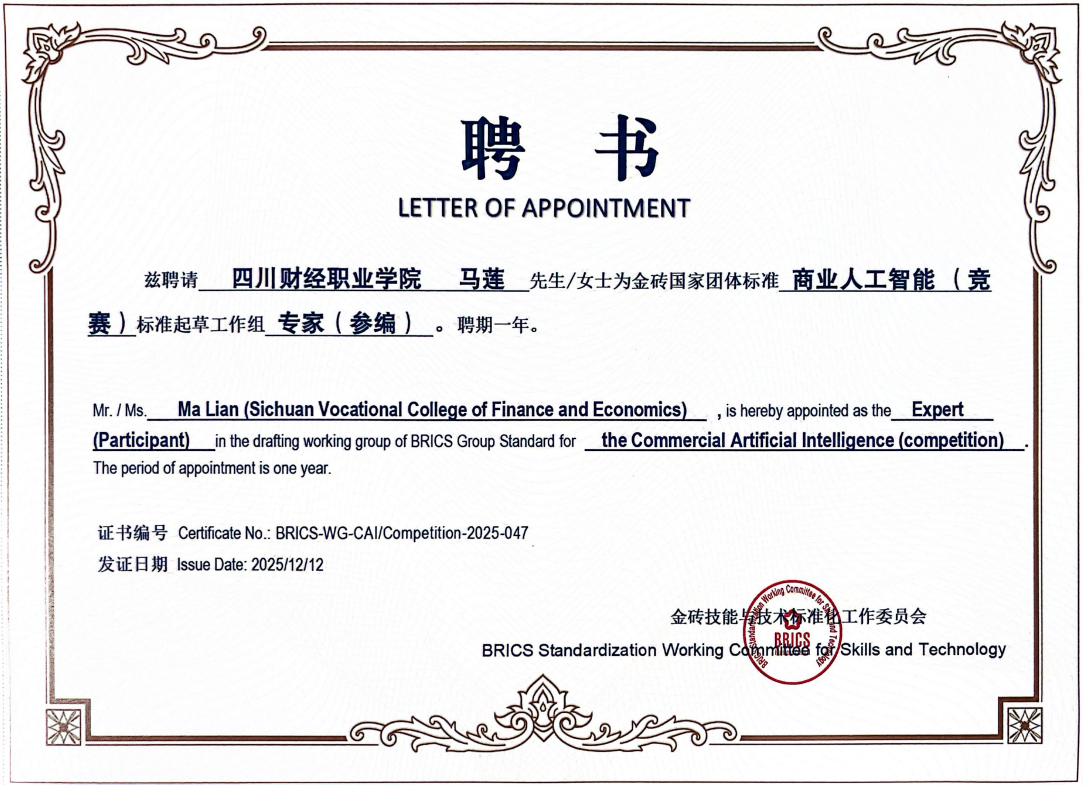 我校大数据技术教研室主任马莲受邀参与此次高水平国际会议,并凭借深厚的专业积淀与丰富的教学实践经验,成功受聘为金砖国家团体标准“商业人工智能”标准起草工作组专家,更标志着大数据技术专业正式跻身金砖国家技能标准化建设的国际协作网络,为专业国际化建设迈出了具有开创性意义的第一步。