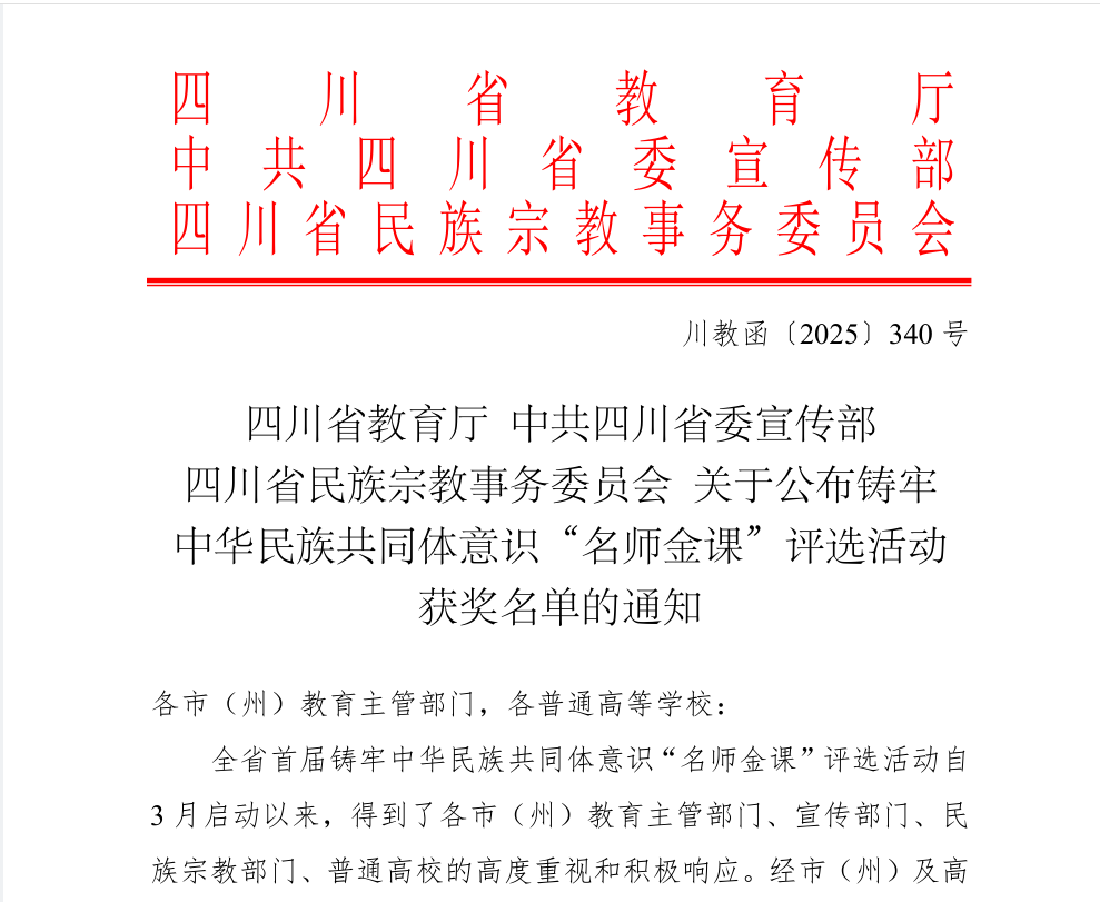 近日,四川省教育厅、中共四川省委宣传部、四川省民族宗教事务委员会联合发布《关于公布铸牢中华民族共同体意识“名师金课”评选活动获奖名单的通知》(川教函〔2025〕340号)。我校在此次评选活动中表现优异,荣获一等奖1项、二等奖1项。