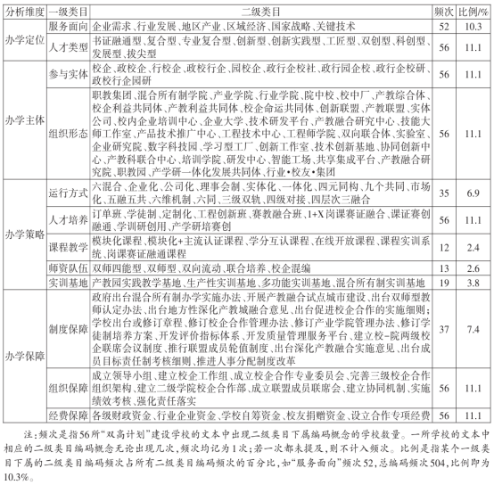本研究数据来自全国56所首轮“双高计划”高水平学校建设单位的项目总结报告、中期自评报告等。首先对报告中与产教融合、校企合作相关的文本内容进行开放式编码,共提取到132个初始概念,将其作为二级类目。然后将初始概念进行关联与整合,得到12个关联式编码,将其作为一级类目。由此,得到56所学校办学模式构建的现状概括表。见表2