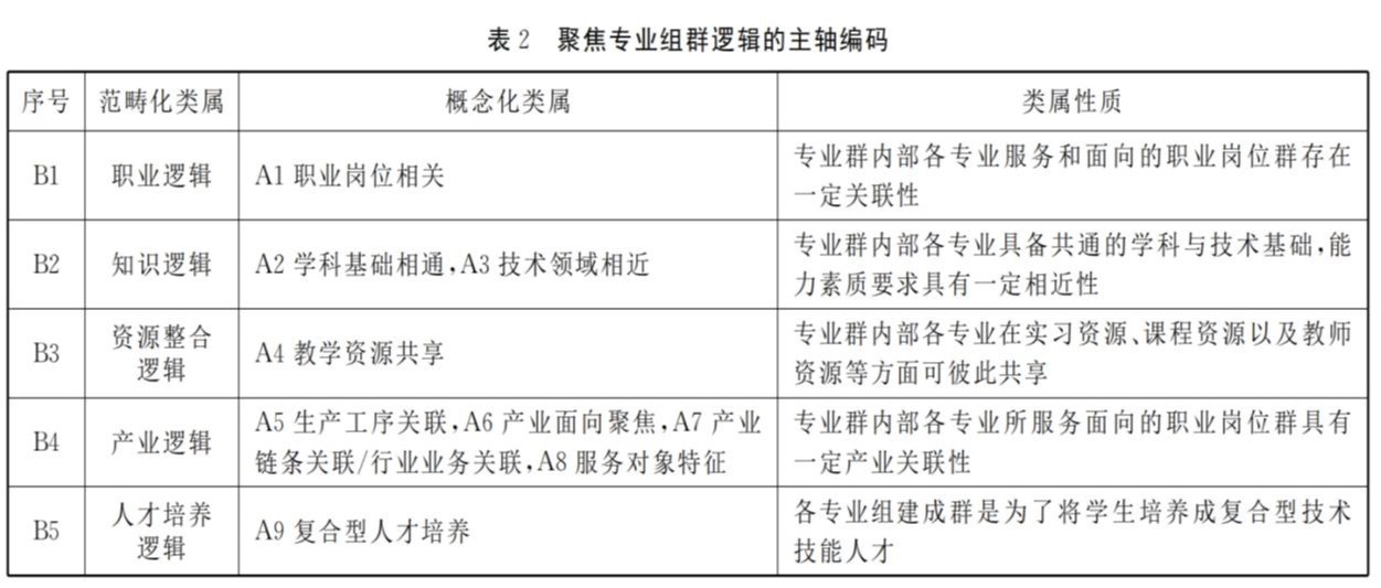 (2)主轴编码。主轴编码是根据一定原则对概念化编码进行“缩编”,用范畴来发展和建立概念化类属之间的关联性,也就是将取出的概念“打破”、“揉碎”,进而重新根据研究目的和相关原则对这些概念进行综合,这一过程包含挖掘范畴、为范畴命名、发掘范畴的性质三个基本过程。“理论化是解释性的,而且它不仅要将原处材料提炼成概念,而且还要将概念安排到一个逻辑的、系统性的解释性图式中。”如表2所示,本研究在比较分析9个概念化类属之后,最终得到5个范畴化类属,分别为职业逻辑、知识逻辑、资源整合逻辑、产业逻辑、人才培养逻辑。