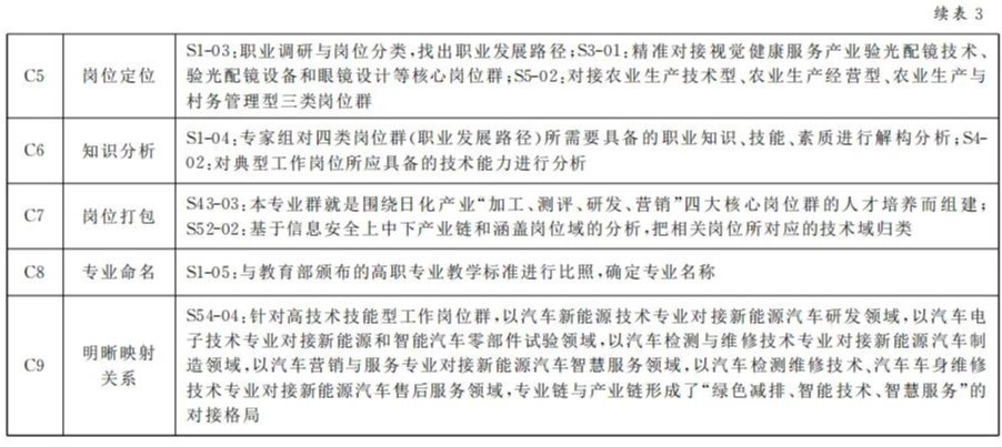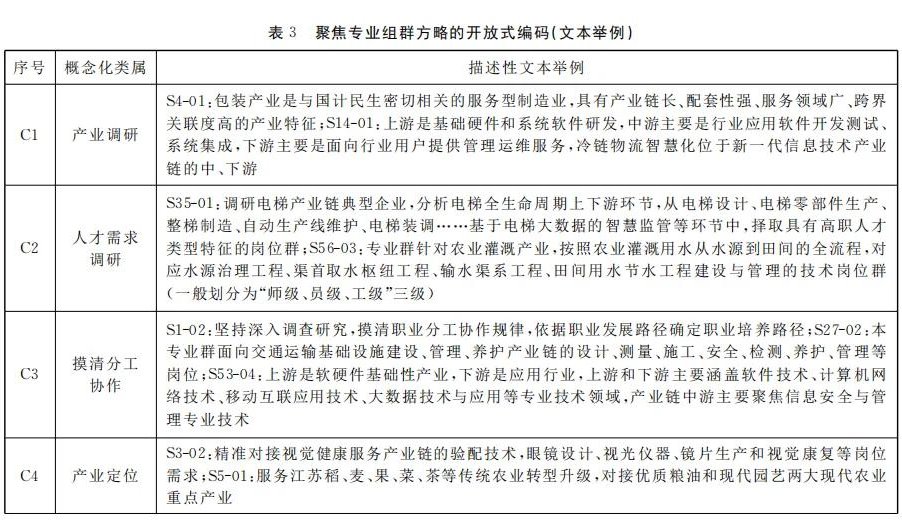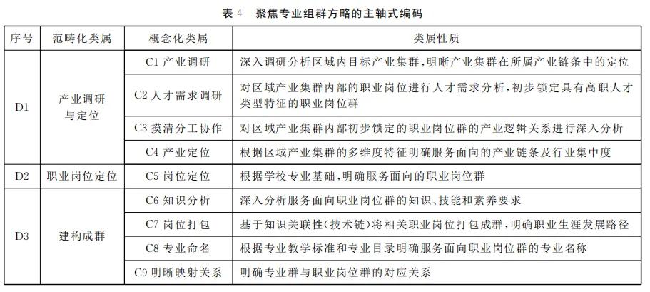 (2)主轴编码。主轴编码是对初始概念进一步展开聚类分析,形成更有概括性和综合性的抽象编码。如表4所示,通过不断比较分析开放式编码所获得的9个概念化类属,本研究最终形成了3个范畴化类属,分别是产业调研与定位、职业岗位定位、建构成群。