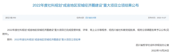 为全面贯彻落实《成渝地区双城经济圈建设规划纲要》,按照四川省委和重庆市委关于深化合作推动成渝地区双城经济圈建设的相关部署,四川省社科联和重庆市社科联共同协商启动2022年度社科规划“成渝地区双城经济圈建设”重大项目。该项目计划立项总数四川、重庆各为10项左右,每项资助金额5万元。