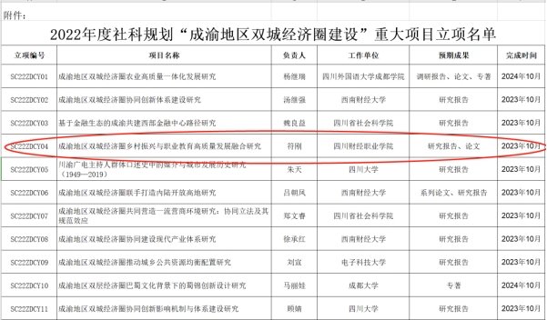 10月26日,四川省哲学社会科学规划办公室正式公布了2022年度社科规划“成渝地区双城经济圈建设”重大项目立项名单,我院符刚教授主持的项目《成渝地区双城经济圈乡村振兴与职业教育高质量发展融合研究》获得批准立项。
