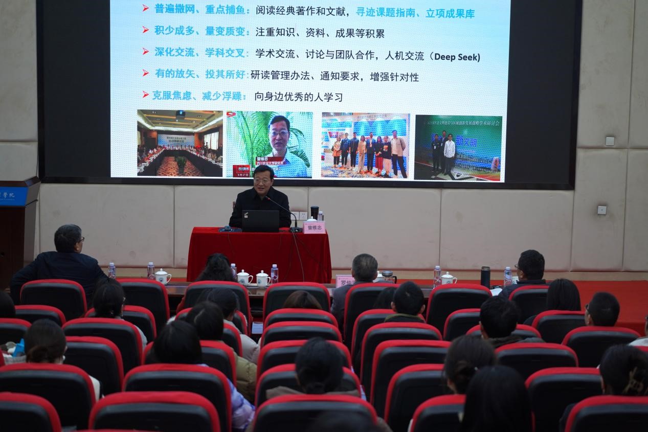 曾维忠教授重点讲解选题需要坚持的四大原则,即需要性原则、科学性原则、创新性原则、效益性原则,在选题方向要注意聆听时代脉搏,要有明确的科学问题,要有重要的理论价值、应用前景广阔并可预见等,忌讳选大、选空、选热。曾教授结合个人研究项目,详细讲授如何写好申报书,将撰写的心得体会分享给在座的教师。