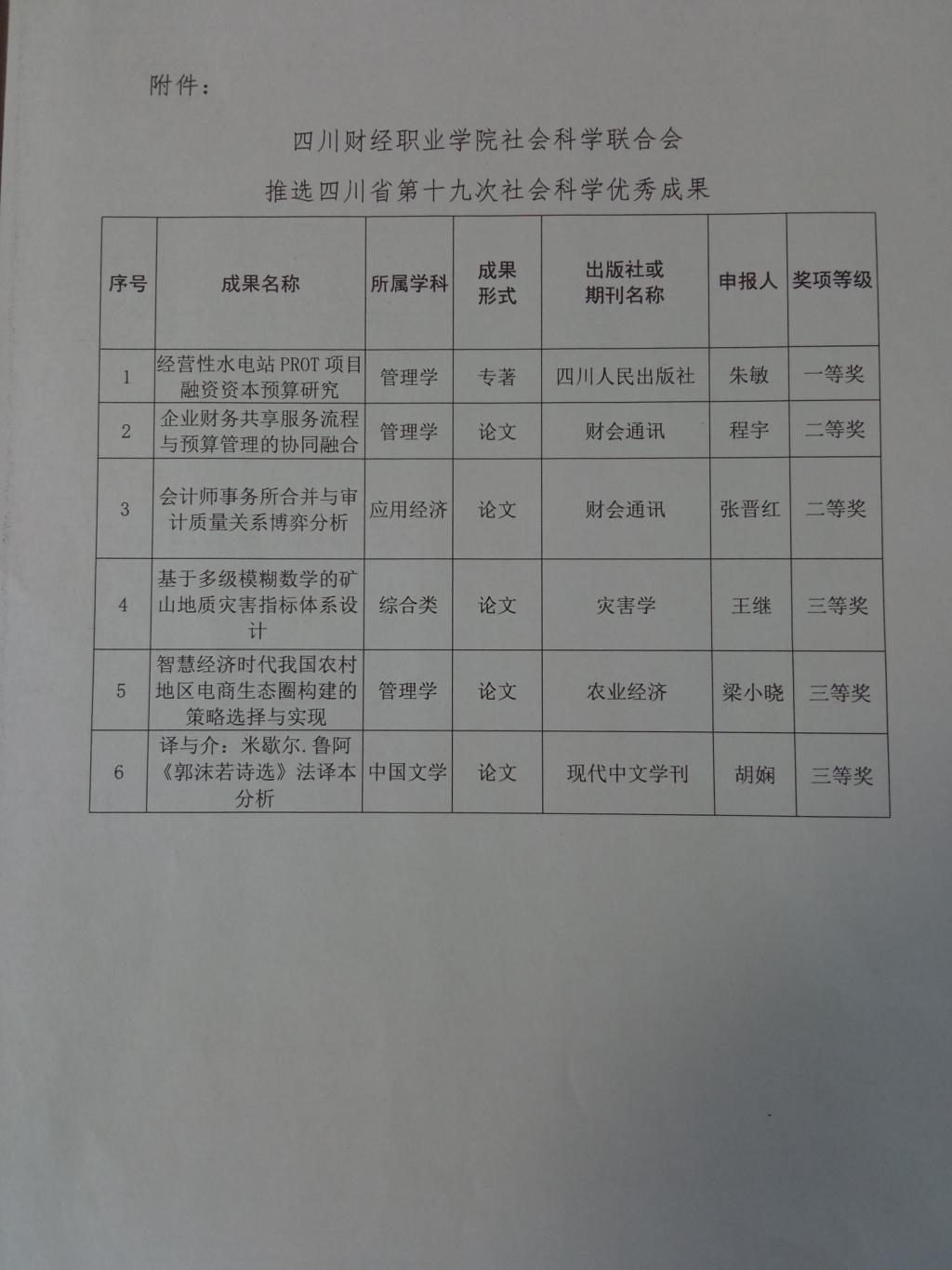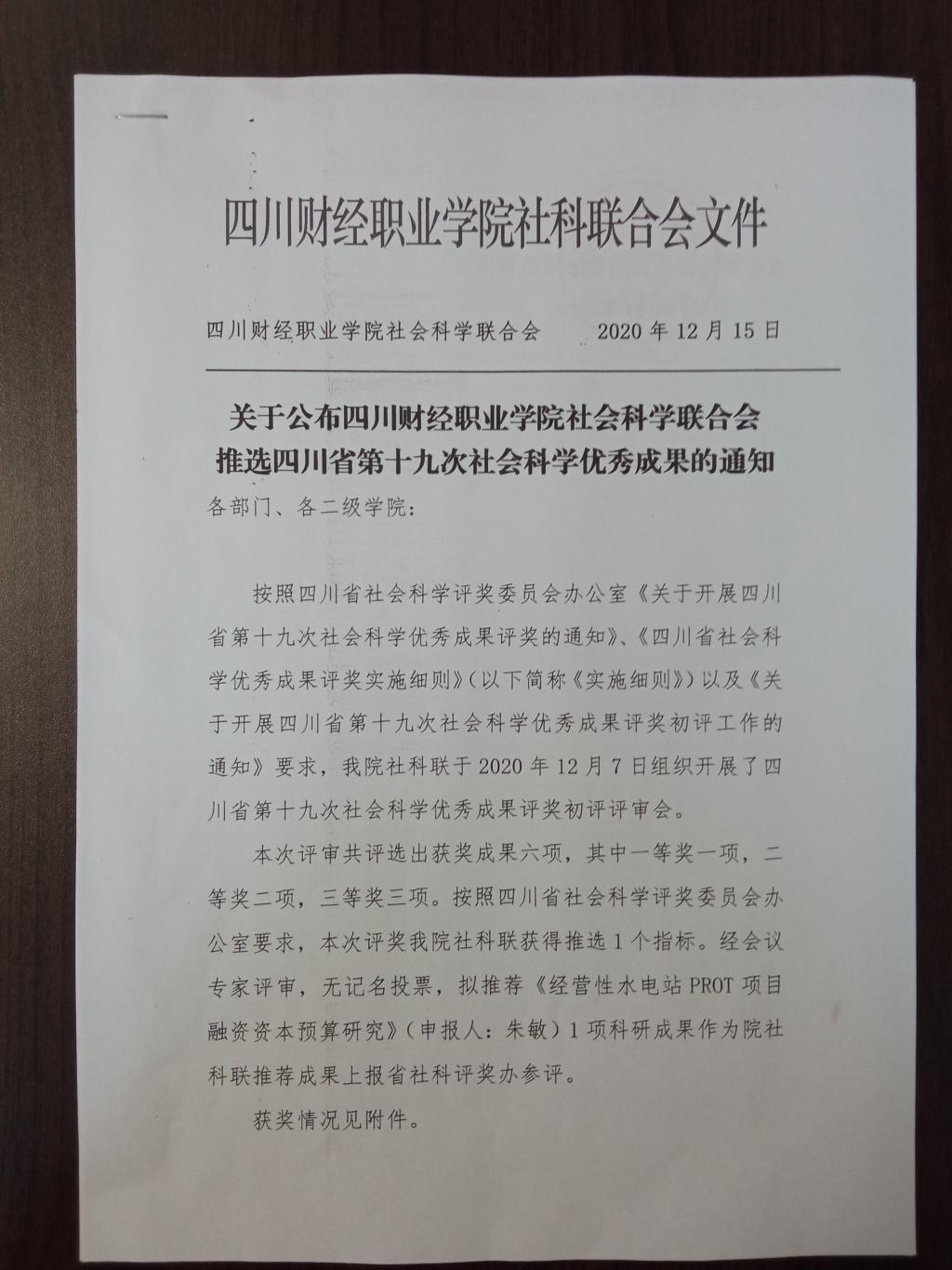 本次评审共评选出获奖成果六项,其中一等奖一项,二等奖二项,三等奖三项。按照四川省社会科学评奖委员会办公室要求,本次评奖我院社科联获得推选1个指标。经会议专家评审,无记名投票,拟推荐《经营性水电站PROT项目融资资本预算研究》(申报人:朱敏)1项科研成果作为院社科联推荐成果上报省社科评奖办参评。
