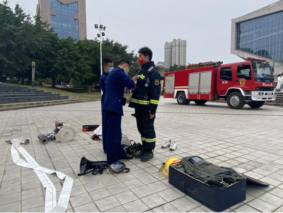 我院两名同学在消防员的讲解与引导下,试穿消防战斗服,体验消防员身着数十斤的装备,感受消防员所肩负的重任。