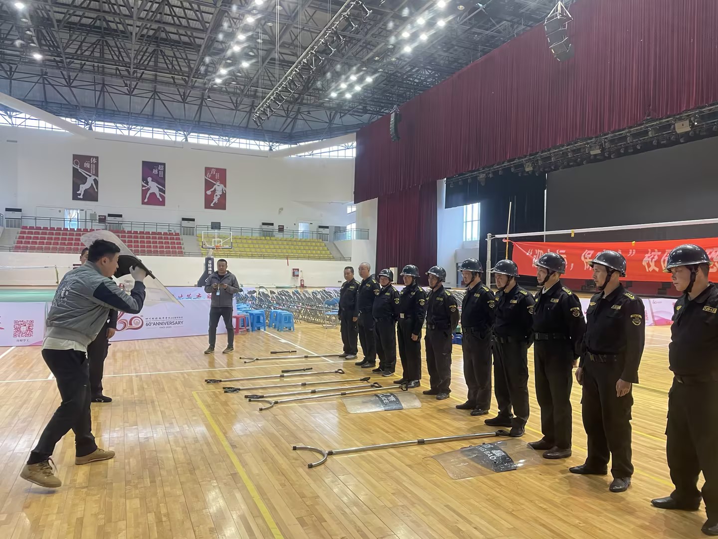 本次反恐防暴实战演练以“驾车冲撞、人员聚集、持刀砍杀”三类不同暴恐情景相继展开的专项培训。武装保卫部防暴干事雷宇对防暴盾牌、防暴钢叉的使用和战术队形运用进行了详细指导。