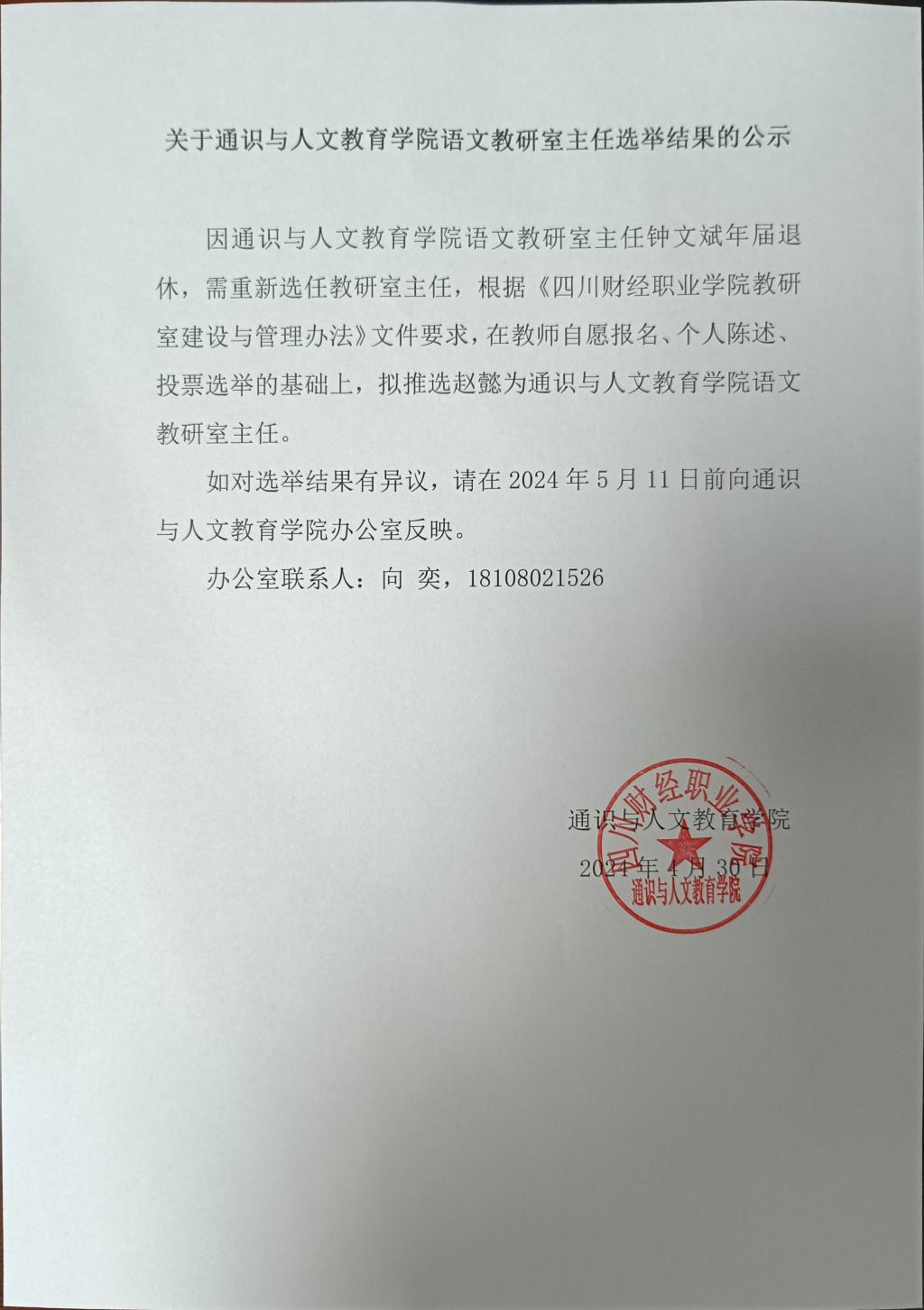 关于通识与人文教育学院语文教研室主任选举结果的公示
