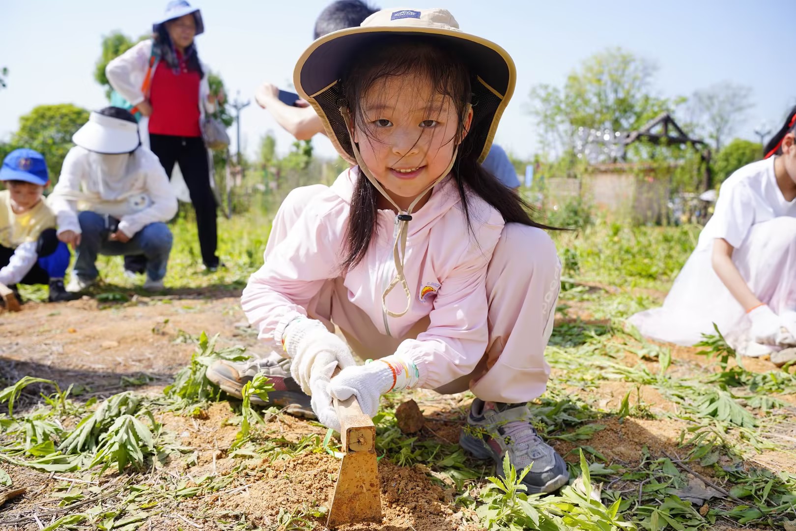 活动创新融合劳动教育与语言服务特色。总工会的工作人员和志愿者们精心设计"农作物知识配对"互动游戏,通过中英双语卡片教学,让孩子们在趣味竞答中学习农耕词汇;田间课堂上,孩子们在党员教师和志愿者的帮助下亲手栽种辣椒苗、采摘胡豆,从松土到收获全程体验"汗滴禾下土"的劳作意义。