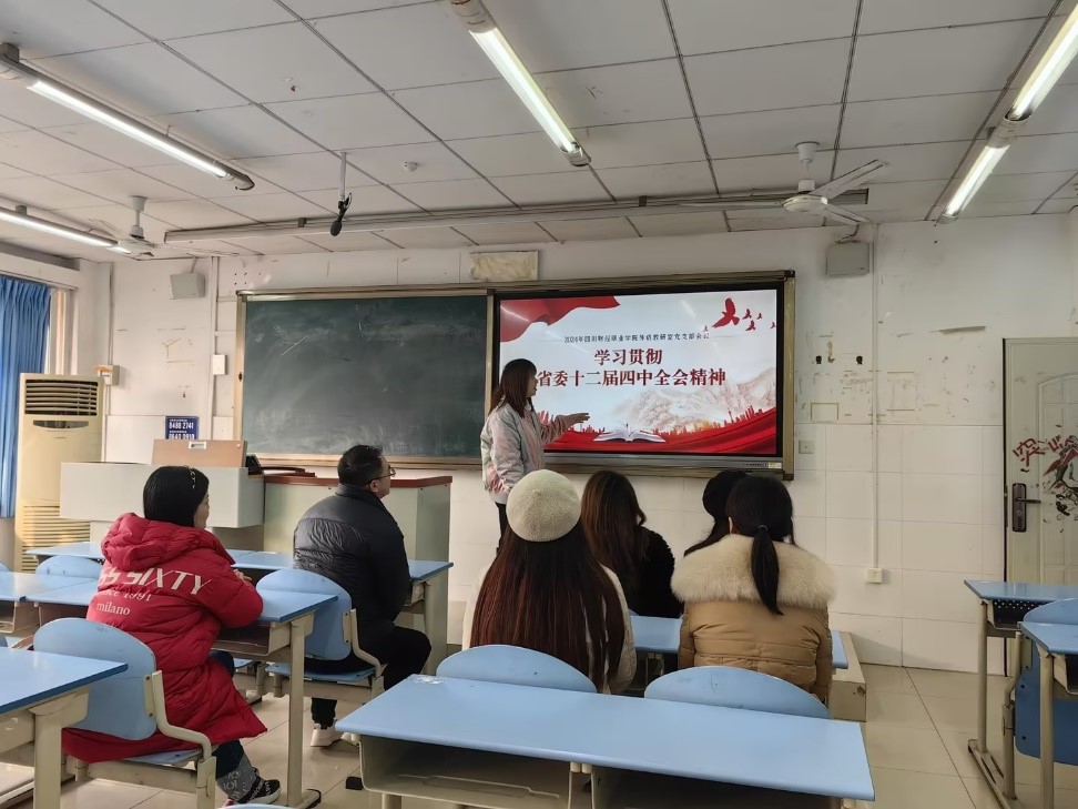 1月10日,通识与人文教育学院外语教研室党支部开展书记讲党课,专题传达学习省委十二届四次全会精神,准确领会把握核心要义和精神实质。