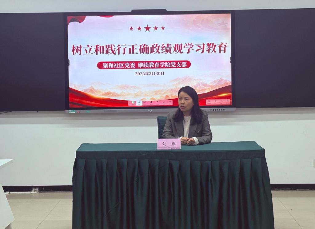 为全面学习贯彻习近平总书记关于树立和践行正确政绩观的重要论述,进一步提升党员干部的政治素养和履职能力,2026年3月30日下午,继续教育学院党支部和聚和社区党委在知行楼106教室联合开展以“联学共建强党性,实干担当树政绩”为主题的专题学习活动。学习活动由继续教育学院党支部书记刘瑶主持,两支部15名党员同志参加。