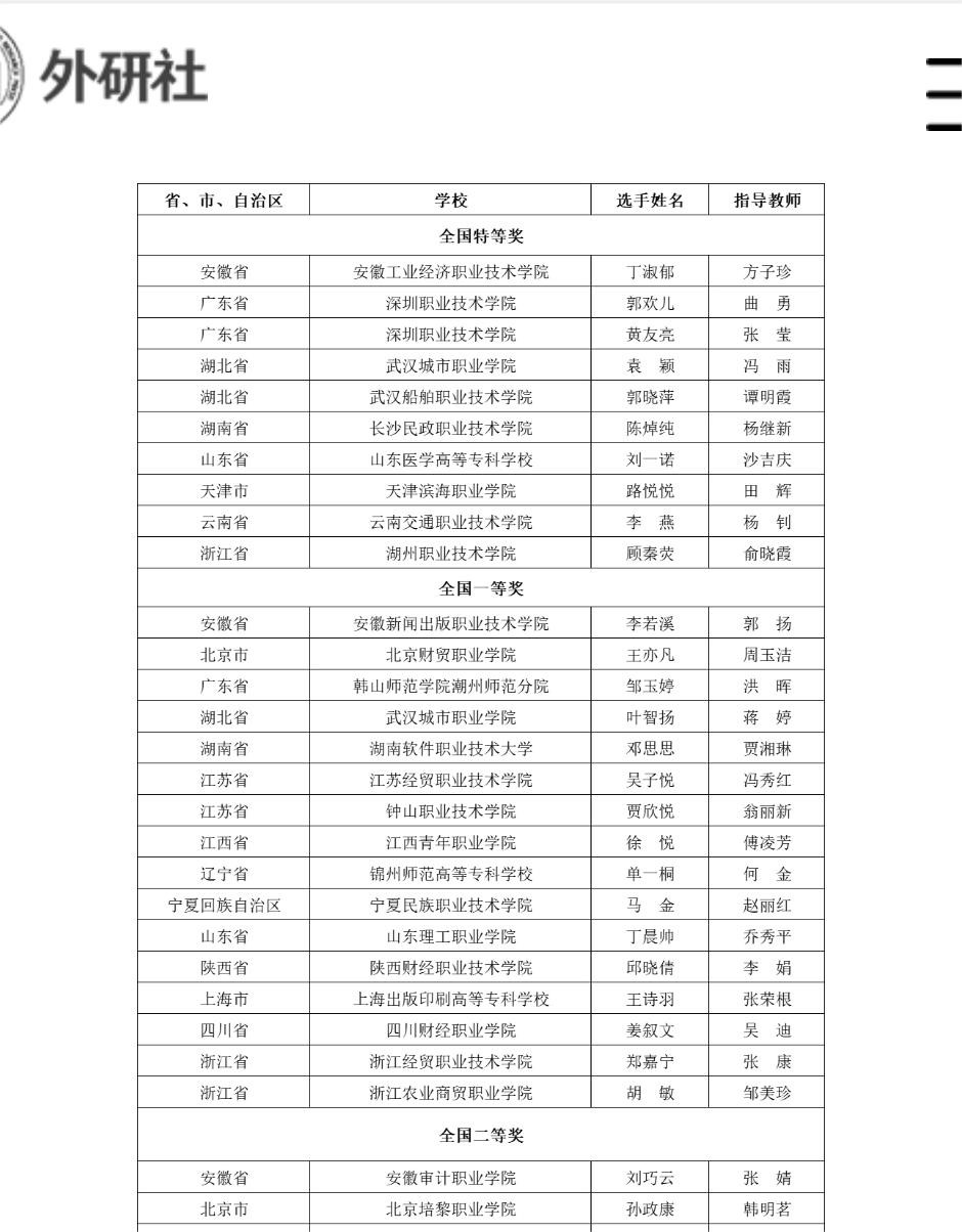2022年12月17日,2022“中国教育电视台. 外研社杯职场英语挑战赛”写作大赛全国决赛在云端举行。由我院吴迪老师指导的学生姜叙文作为省赛的胜出者,代表四川省参赛,与来自全国28个省、市、自治区的83名职教学子角逐佳绩。最终,姜叙文同学不负众望,一举获得全国一等奖的优异成绩,为我校争得了荣誉。