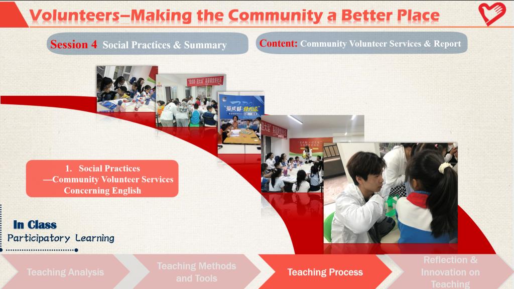 参赛团队立足学校实际情况,积极投身课程思政改革实践,充分利用学校与龙泉驿区东安街道办事处、中法(成都)生态园三方共建的校地园区创新中心(社区学院)作为实践平台,将英语课堂搬出教室,走进社区,服务社区。积极参与东安街道合作举办的“爱成都▪迎大运,英语课堂进社区”活动,带领学生学以致用,投身社区志愿服务,开展丰富多彩的公益活动,给社区居民上了一堂堂生动有趣的英语课。