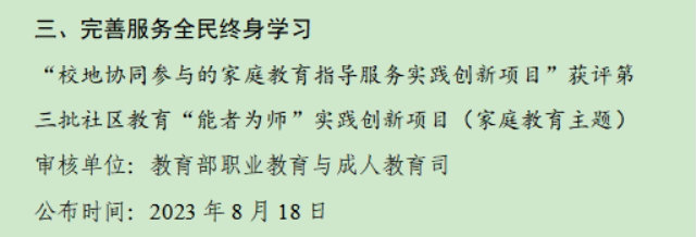 2023年8月18日,教育部职业教育与成人教育司发文公布了社区教育“能者为师”实践创新项目立项名单,我院职业素养教研室符丹老师申报的“校地协同参与的家庭教育指导服务实践创新项目”成功获评教育部第三批社区教育“能者为师”实践创新项目(家庭教育主题)。