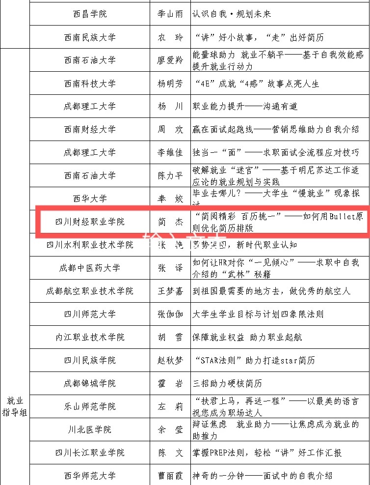为深入学习贯彻党的二十大和省委十二届二次全会精神,全面落实党中央、国务院和省委、省政府关于高校毕业生就业创业工作的决策部署,切实提升我省高校就业创业和职业生涯教育教学水平,促进我省高校毕业生更加充分更高质量就业,今年5月,由四川省教育厅、四川省人力资源和社会保障厅主办,四川省高校学生信息咨询与就业指导中心、西华师范大学联合承办的四川省2023年高校就业创业指导金课评选活动省级评选初评圆满结束。我院职业素养教研室推荐参选的作品《“简阅精彩,百历挑一”--如何用Bullet原则优化简历排版》在全省高校的208个优秀作品中突出重围,晋级复评名单。
