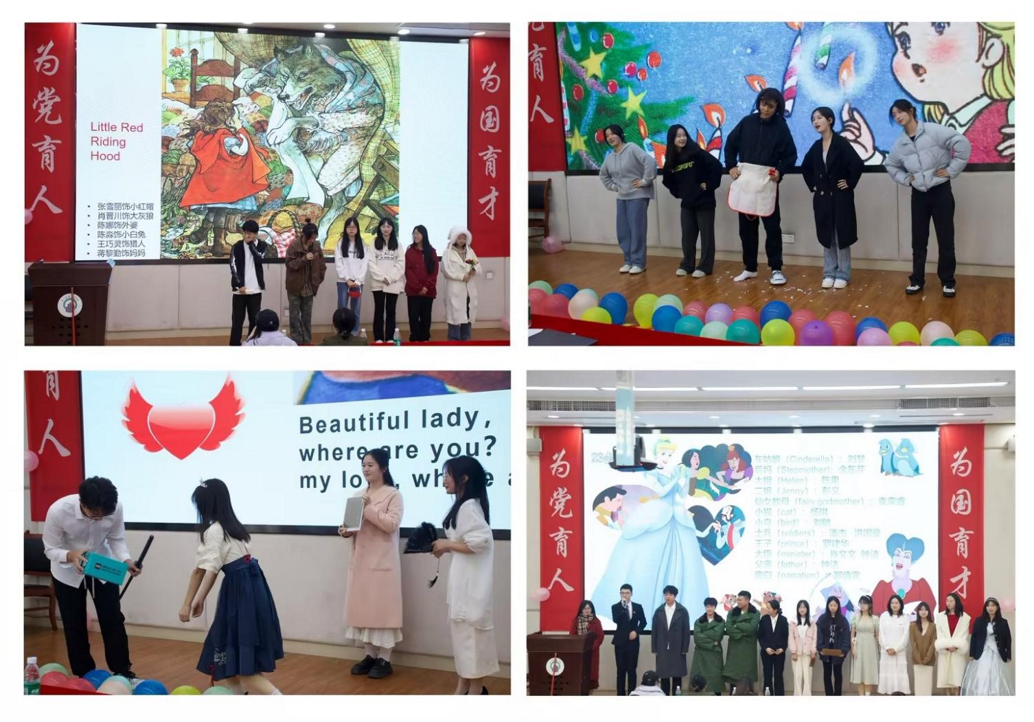 接着,“卖火柴的小女孩”队伍用深情而动人心弦的演出征服了观众。他们巧妙地将简单朴素与深刻内涵结合起来,在寒冷中寻找温暖这一主题引发观众强烈共鸣。小女孩的扮演者凭其精湛的演技将活动氛围推向高潮。“灰姑娘”作为第四个登场队伍,则用其温馨浪漫、转折跌宕的剧情吸引了观众眼球。选手们不仅展示了较高的英语水平和扎实的戏剧功底,也通过团队合作展现了出色舞台魅力。