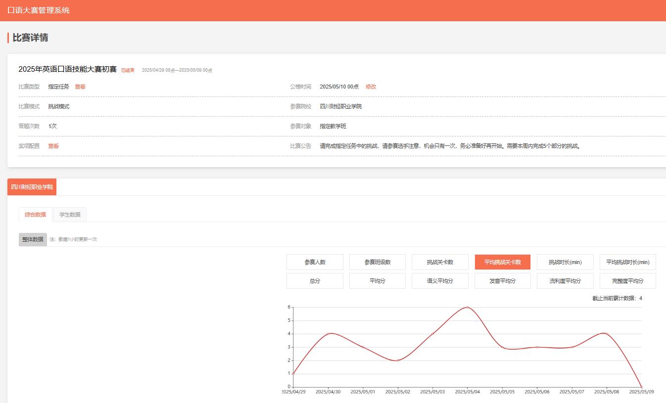 为深化职业院校英语教学改革,提升学生英语应用能力,四川财经职业院校2025年英语口语技能大赛于5月8日-5月20日举办。本次大赛以“讲好中国故事,展现职业风采”为主题,旨在为四川省职业院校技能大赛英语类赛项选拔优秀人才,同时探索AI技术赋能语言教育的新路径。
