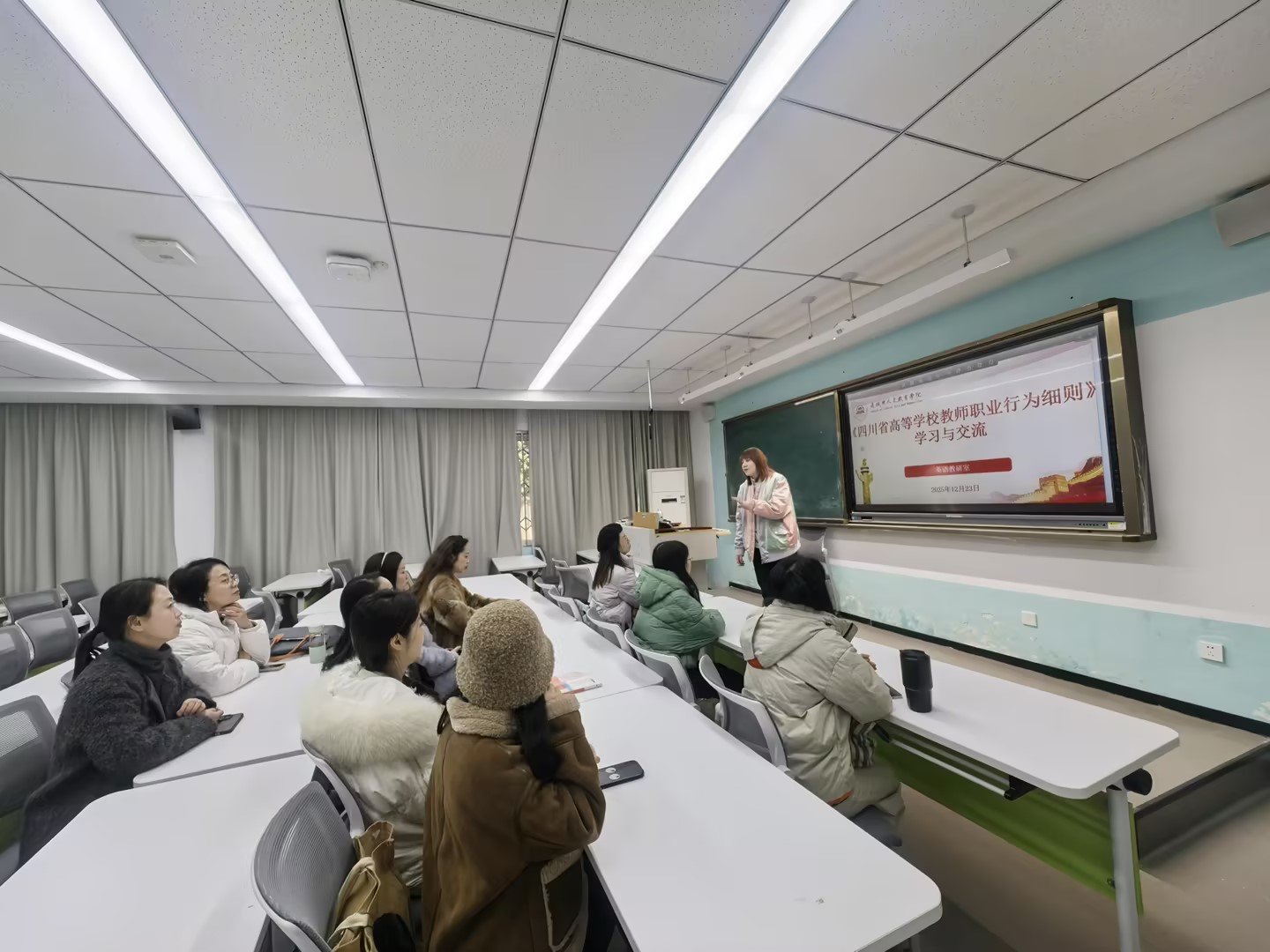 为深入落实上级教育部门及学校师德师风建设工作部署,提升教师思想政治素质与职业素养,2025年12月23日上午,通识与人文教育学院英语教研室在教研室主任李妍妍老师带领下,开展《四川省高等学校教师职业行为细则》(以下简称《细则》)专题学习研讨会,以“学细则、守底线、正师风”为核心,推动职业规范内化于心、外化于行。