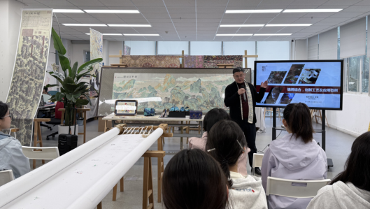 活动中,AI新锦绣开创者钟明老师围绕蜀绣蜀锦与现代技术的融合创新,以实物、PPT和视频等形式详细讲解。他分享了如何借助技术在图案、色彩、工艺上突破,展现传统与现代结合的魅力。同学们结合财务、营销等相关专业知识,积极互动,就非遗产品形式与推广建言献策,如开发系列文创,利用新媒体讲好AI锦绣故事,推动非遗适应市场,创新发展等。