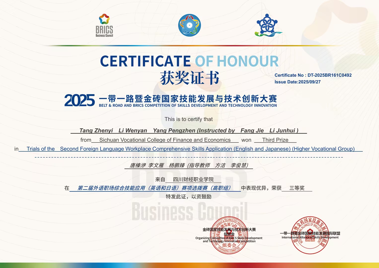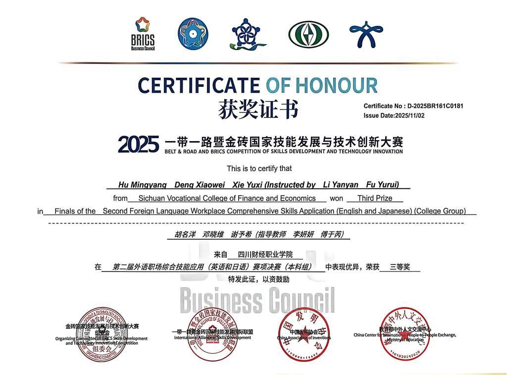 本科1组国赛-2025一带一路暨金砖国家技能发展与创新技术大赛-第二届外语职场综合技能应用(英语和日语)赛项选拔赛(高职组)三等奖