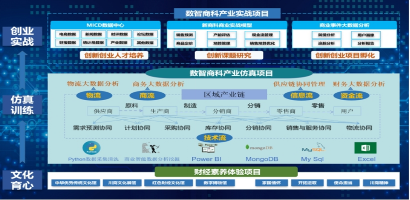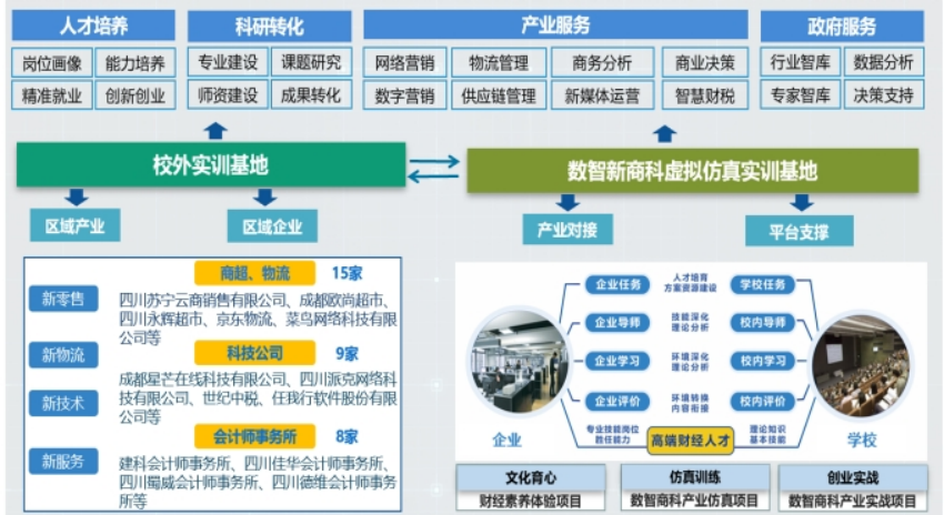 “数智新商科虚拟仿真实训基地”对接四川省“4+6”现代服务业体系,结合《国家数字经济创新发展试验区(四川)建设工作方案》目标要求,引入四川省高端生产性服务业商务服务、流通服务代表性企业—四川省商业投资集团有限责任公司,以“产教融合、师资共建、人才共育、成果共享”为路径,整合高端生产性服务业“产业链、人才链、技术链、创新链”,运用虚拟现实等新兴信息技术,集成原有的实训平台和资源,“以虚助实、虚实结合”,对接企业,仿真业务场景、多链交叉,仿真业务流程、技术赋能,仿真业务数据的思路,打破原有专业边界,校企壁垒,嵌入数智逻辑,激发学生学习兴趣和创新动力,打造一个自适应“产学研用”生态圈,解决人才实践教学培养过程中商业场景不确定(难再现)、商业秘密(难接触)、实习场景难搭建(成本高) 、数智资源(难获取)等困境,培养具有强烈社会责任感、跨界复合的数智新商科人才,服务于国家和区域产业与社会数字化转型。