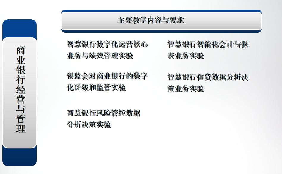 智慧银行数字化运营决策仿真实验课程拟解决银行顶岗实习接触不到后台核心业务的难题。学生可以分组扮演行长/信贷经理/投资经理经营6家银行,学生参与度和竞技性强。在几乎真实环境中体验商业银行全面运营,解决理论讲解银行内部管理比较空的难题。