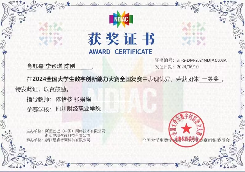 个人荣誉:四川省优秀毕业生。在校期间学业成绩优异,综合素质突出,多次获得校级三好学生、优秀学生干部标兵等荣誉称号。在学科竞赛方面表现尤为突出,曾获全国职业院校技能大赛高职组商务数据分析二等奖、2023跨金砖国赛二等奖、2023年“建行杯”四川省创新创业大赛银奖、全国大学生商业数据分析与应用大赛高职组一等奖等国家级、省级奖项累计10余项,展现出扎实的专业能力与突出的综合素质。