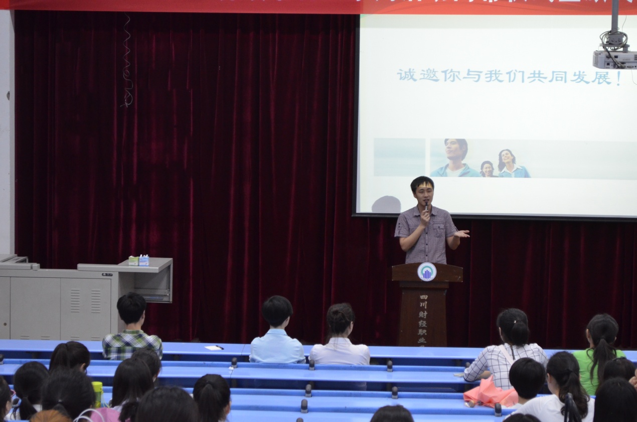 成都金税订单班宣讲会主要围绕“公司简介”、“员工职业生涯规划”、“薪酬体系”、“招聘流程”四个大方面展开。随后,我系毕业的10级学生郑星竹和正在实习的12级学生张坤和魏正国同学进行工作经历分享。他们讲述了个人在成都金税公司的工作经历和成长锻炼,鼓励在场的学弟学妹们努力锻炼个人能力。 其中,12级张坤学长,同时也曾是团副的他反复强调了“吃苦耐劳,敢于实践,勇往直前”对于工作的重要性。最后,人事部唐经理对会议进行了总结,对同学们提出的关于招聘流程的相关问题做出了解答。