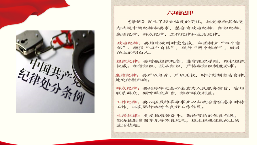 会议共计三项议程。首先由总支书记杨晓荣同志组织学习《中国共产党纪律处分条例》,紧紧围绕《条例》的重要意义、主要内容和贯彻落实三方面多维度进行生动阐述。同时结合典型案例,就违反政治纪律、组织纪律、廉洁纪律、群众纪律、工作纪律、生活纪律的行为进行详细解读。会议强调全体教师党员要按照《条例》严于律己,做到懂法纪、明规矩、知敬畏、存戒惧,将党规党纪内化于心,外化于行,切实做好本职工作。