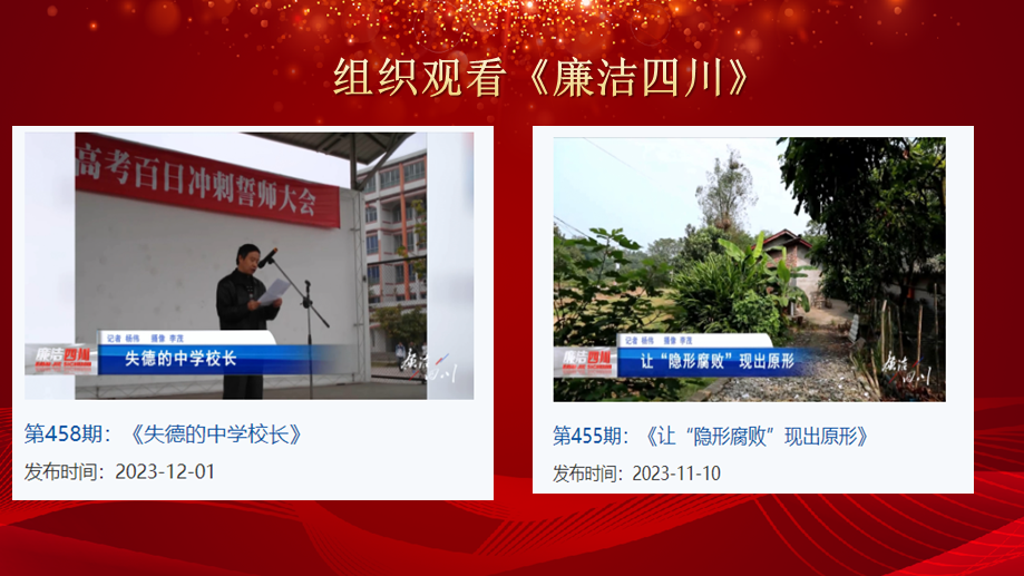 最后,组织观看《廉洁四川》栏目警示教育片《失德的中学校长》、《让“隐形腐败”现出原形》,并加以案例强调廉洁教育重要性,教育引导党员同志奋发有为、行稳致远,最大限度地预防和遏制违纪违法现象的发生。