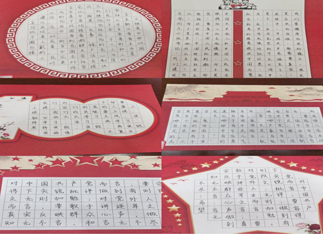 书法比赛期间,同学们积极主动参与,在对党史、新中国史、改革开放史充分了解后,进行了认真创作,同时习读了毛主席《沁园春.长沙》、《菩萨蛮.大柏地》等诗词以及习近平总书记相关语录,了解到他们的家国大义和为人民谋福祉的治国理念,在展示同学们的书法艺术修养的同时更是一堂深刻的爱国主义实践课。