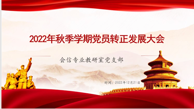 首先,会计信息管理教研室党支部书记常竞老师公布了本期 “预备党员转正”公示情况,本期拟发展为正式党员同志为许军同志,许军同志于2021年12月21日加入中国共产党,预备期一年,现预备期满,并于2022年12月9日向党支部递交了转正申请书。经我党支部2022年12月12日支委会讨论和信息学院党总支2022年12月12日总支委会审议,认为许军同志在预备期表现良好,于是召开本次支部党员大会,讨论和表决是否同意许军同志按期转为中共正式党员事宜。