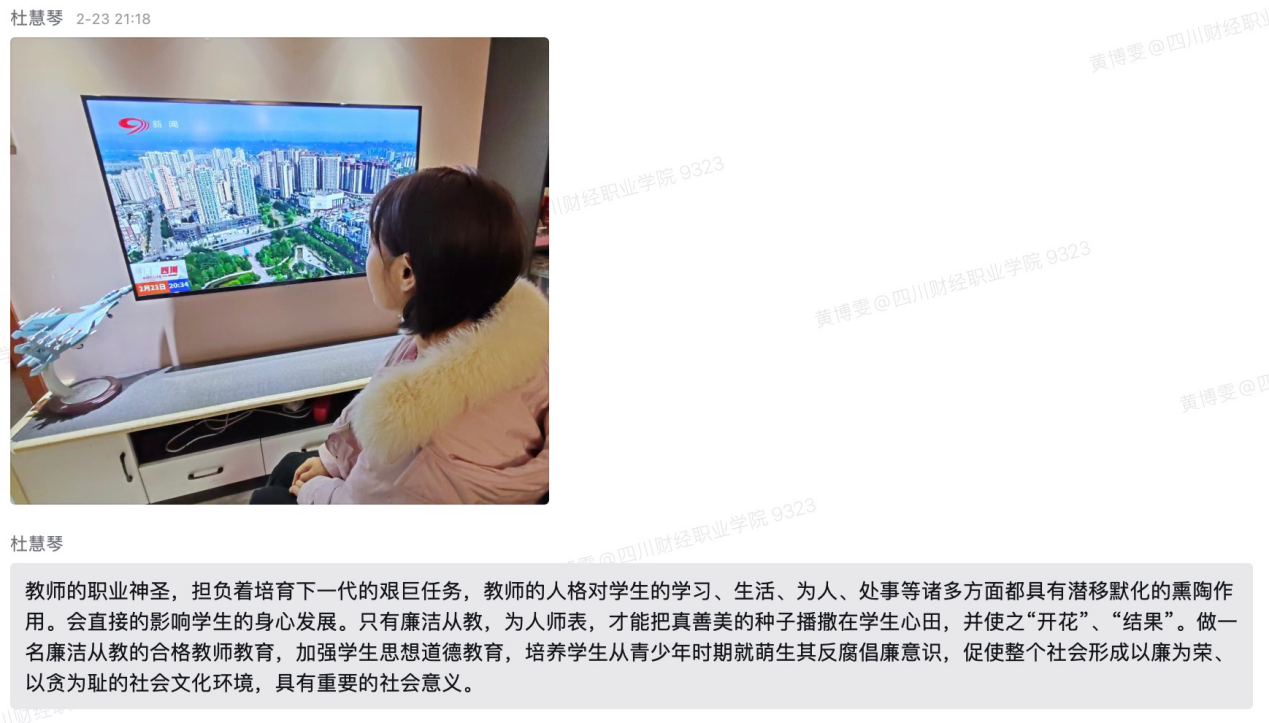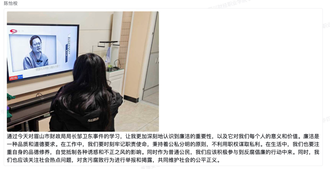 主题学习由信息学院大数据技术教研室党支部书记王曦主持,大数据技术党支部全体党员教师参加。2024年2月23日晚8:30,四川广播电视台新闻频道《清廉四川》栏目,播出了眉山市东坡区财政局原党组书记、局长邹卫东违纪违法案例警示教育片【“打虎拍蝇记”之《“危险”红线》】,全体党员教师认真观看学习,并积极分享心得体会。
