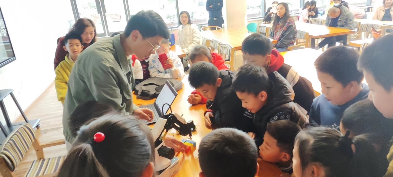 此次社区科普知识讲解不仅从概念上对机器人进行讲解,还在课堂上展示了人工智能实验室中的教学机械臂。在展示过程中,带领着小朋友们感受机械臂如何搬运积木块,小朋友们在感受过程中表现出了浓浓的兴趣。