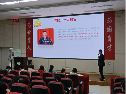 学生党支部书记翟老师紧紧围绕党的二十大报告中,全面建设社会主义现代化国家,以举旗帜、聚民心、育新人、兴文化、展形象、树信仰、做实事展开讲解。在课程中,以视频案例为导入,充分理解中国共产党为什么能、中国特色社会主义为什么好,归根到底是马克思主义行,是中国化时代化的马克思主义行。他说“作为时代新青年的我们,应善于运用大的历史观读好用好党史,心中有信仰,勇挑重担,脚踏实地,在新时代新征程中展现新担当新作为”。