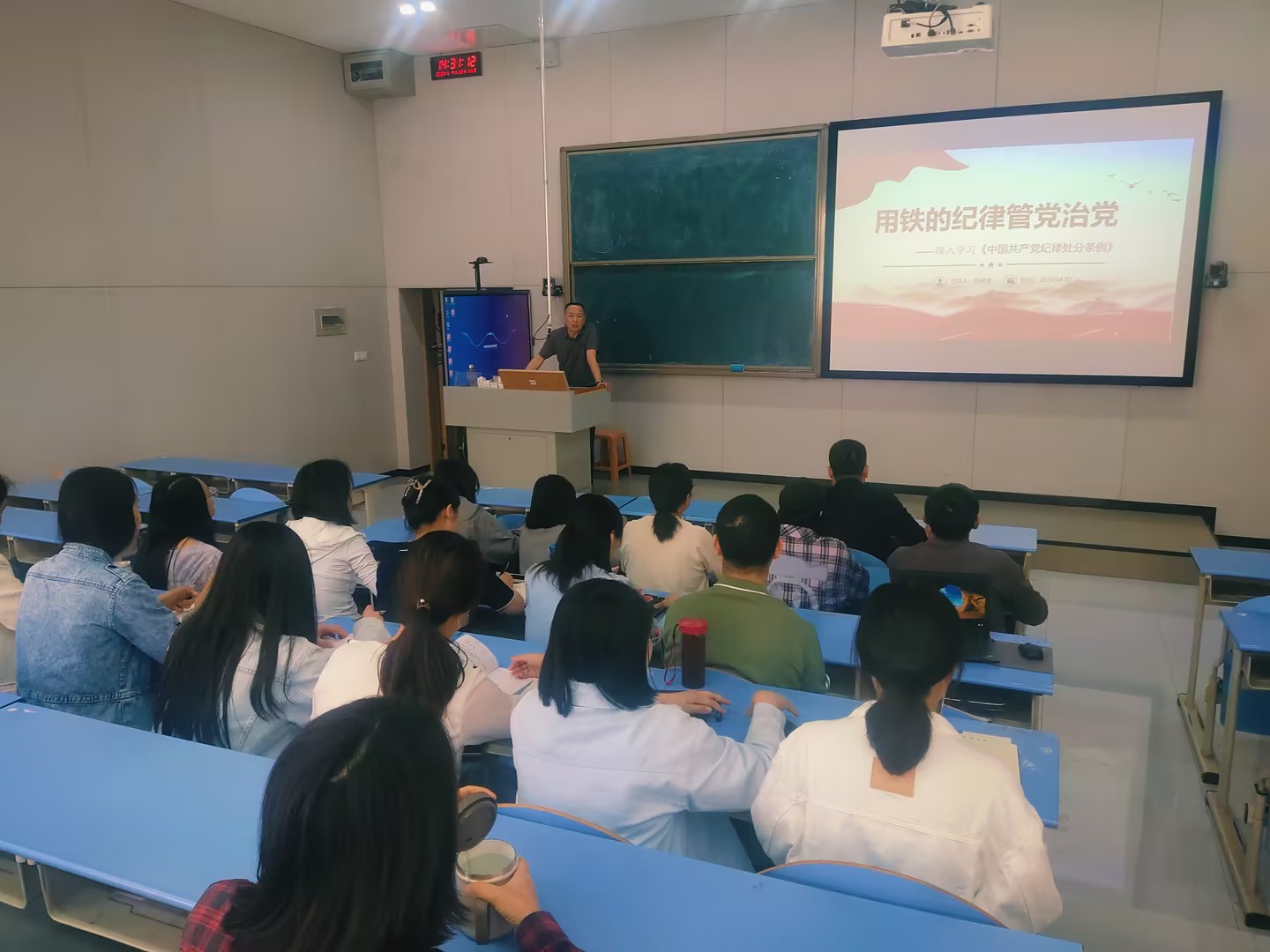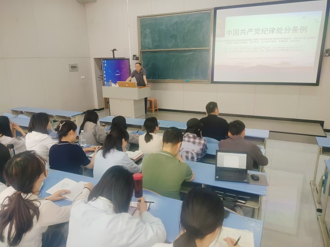 根据党纪学习教育安排,为帮助党员教师深刻理解《中国共产党纪律处分条例》条款要求,真正做到学纪、知纪、明纪、守纪,搞清楚党的纪律规矩是什么,弄明白能干什么、不能干什么,把遵规守纪刻印在心,内化为言行准则,信息学院党总支于4月30日在B211组织召开党纪学习教育专题党课,党课由党总支书记杨晓荣主持,全体党员教师参加。