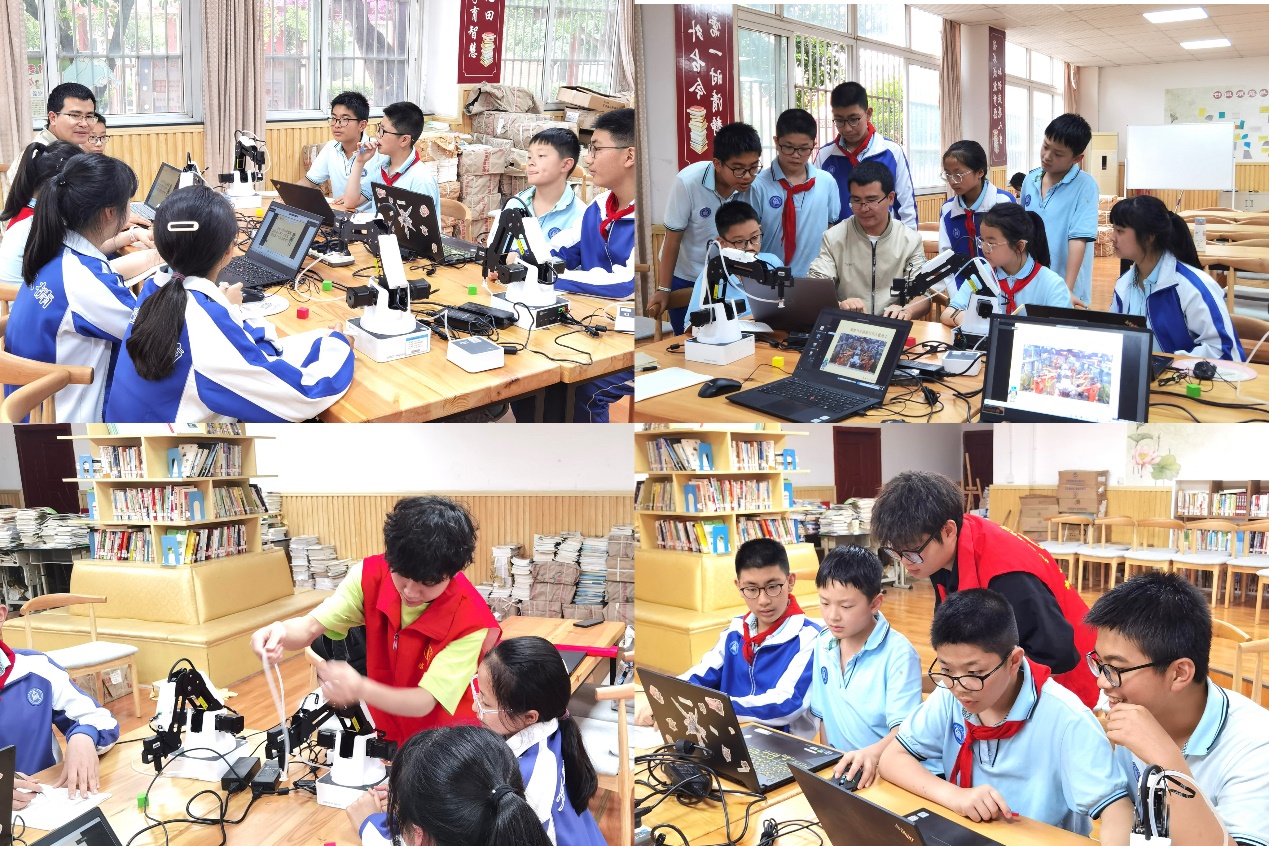 5月10日,7790cnm必发集团信息学院实训教研室主任张娟娟老师、人工智能教研室主任余海老师带领我院人工智能团队,携带4台机械臂一同走进成都市石室双楠实验学校,与该校信息中心主任陈一银老师一起面向本校六年级学生开展了一场别开生面的“AI科普校园行”信息化教育活动。