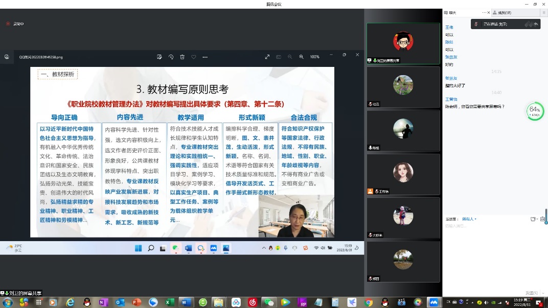 线上老师们各抒己见,集思广益,业财税审融合教学团队参与了研讨,常竞老师分享了学校现开设信息技术类课程情况,指出当前教材的编写需要与人才培养方案衔接,打造适合高职学生的内容;以项目化教学为主开发教学案例,从简单到复杂,调研适应岗位需求的案例融入教材编写。重庆工业职业技术学院的郑丽老师认为系列教材的编写需要融入一点高职现在流行的一些热点,比如现代学徒制、1+X证书、课程思政、技能竞赛等;教材的内容考虑立体化,而不仅仅是一本数字化教材。重庆财经职业学院刘卫老师以SQL+PowerBI作为举例,分析高职课程建设的思路,提出教材需要遵循教育部专业指导标准,可以与企业研讨,系列教材的边界需要理清,课程内容之间需要融会贯通。工作室王伟老师从宏观和微观两个层次对教材开发提出意见:宏观上需要突出职业教育“业财融合”的思维培养;微观上,系列教材内容可以达成信息化与税务、成本等课程内容衔接的目标,并演示八戒财税智能报税系统。