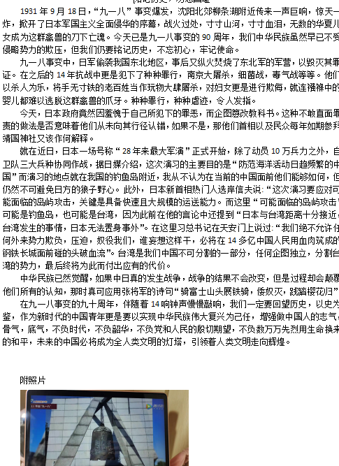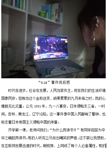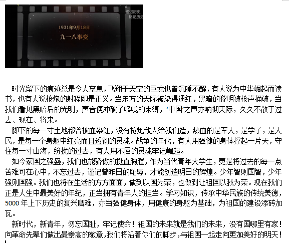 活动中,参赛同学以观看爱国影片并提交500字左右的观后感形式参加活动。同学们通过影片重温了“九一八事变”这段难以忘却的历史,“九一八”,是国耻日,也是“九一八事变”纪念日,更是伟大的中华民族觉醒日,山河破碎不堪回首,侵略罪行铁证如山,这些罪行罄竹难书,这段历史不容忘却。