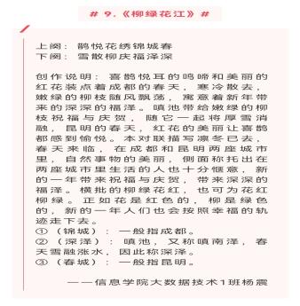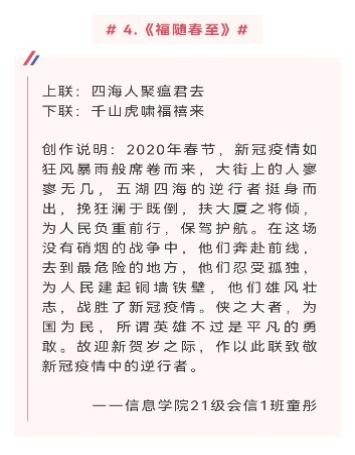 本次活动同学们踊跃报名参与,依照传统对联基本结构、平仄关系等格式要求进行原创的优美的对联创作,期间秘书处与信息编辑部全体成员认真回答各位同学关于春联的疑问,积极收集参与作品,最终通过全体活动负责人的筛选和同学们的投票,选出了九副优秀作品,并在学院微信公众号予以展示,让同学们更加深入地了解传统楹联文化。