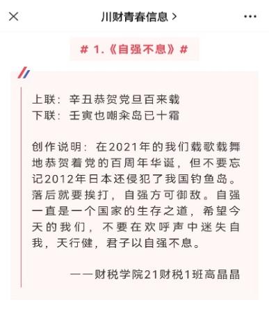 春联,又叫“春贴”“对联”“门对”,是中国特有的文学形式,也是广大人民群众过春节的重要标志。它以对仗工整、简洁精巧的文字表达了中国劳动人民对辟邪除灾、迎祥纳福的美好愿望。为传承传统文化精神,增强春联的影响力和生命力,2021年11月9日-15日信息学院团总支学生会信息编辑部、秘书处共同举办了“忆传统,迎时代”壬寅年春联线上征集活动。