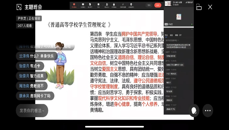 2022年9月7日下午14时,各班辅导员分别召开主题班会对各班新生进行了法律意识教育、安全教育以及文明教育,老师们结合学生手册和丰富的案例进行教育和互动讨论,同学们纷纷发表自身对法律法规、安全和文明的感悟感受。