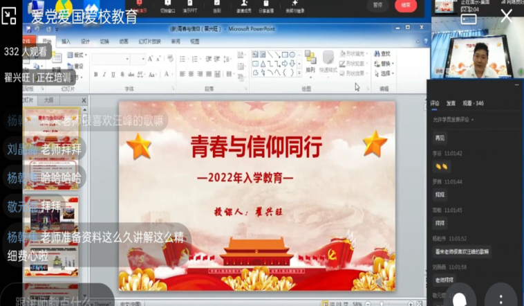 2022年9月7日上午9时,信息学院学生党支部书记翟兴旺老师以“青春与信仰同行”为题进行爱党爱国爱校教育,翟老师首先给同学们讲解中国近代史发展脉络,以沉浸式的教学,还原了我党反帝反封建争取民族独立解放的艰辛。其次,以马克思主义为什么“行”、中国共产党为什么“能”、中国特色社会主义为什么“好”展开互动探讨;随后翟兴旺老师分享了四川省样板党支部建设情况,用视频方式展示了与师大社区结对共建志愿者服务活动开展情况和传承中华传统文化的非遗社团活动开展情况。最后,由毕业生党员李琴同志,分享入党前的初心,入党后的使命感。