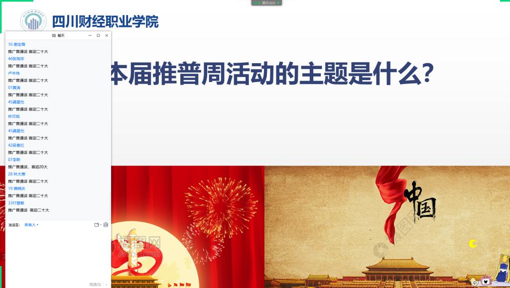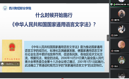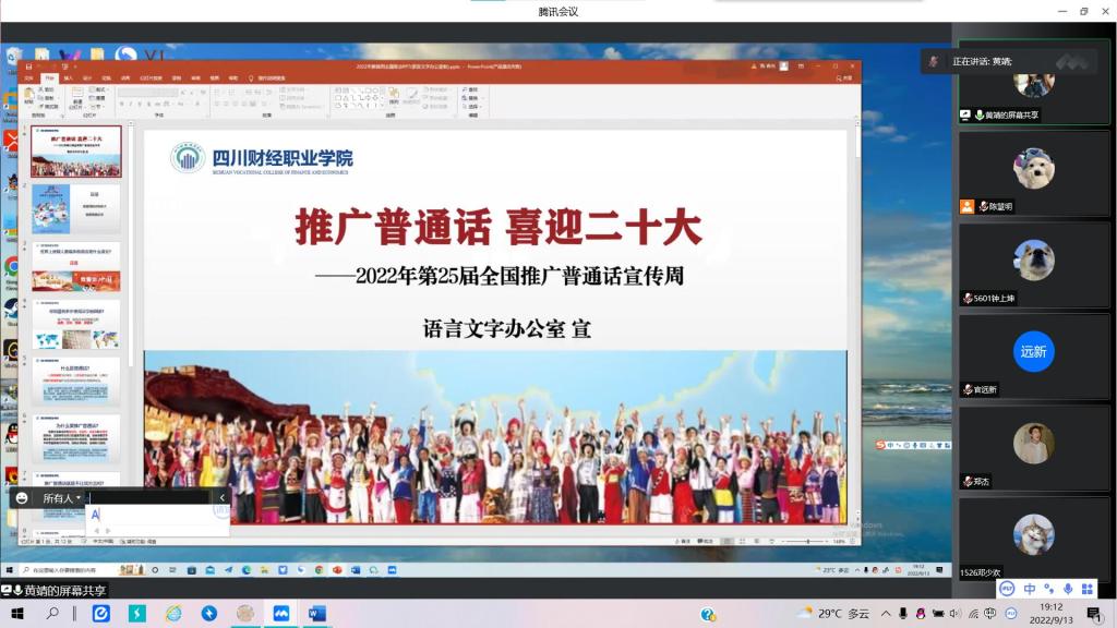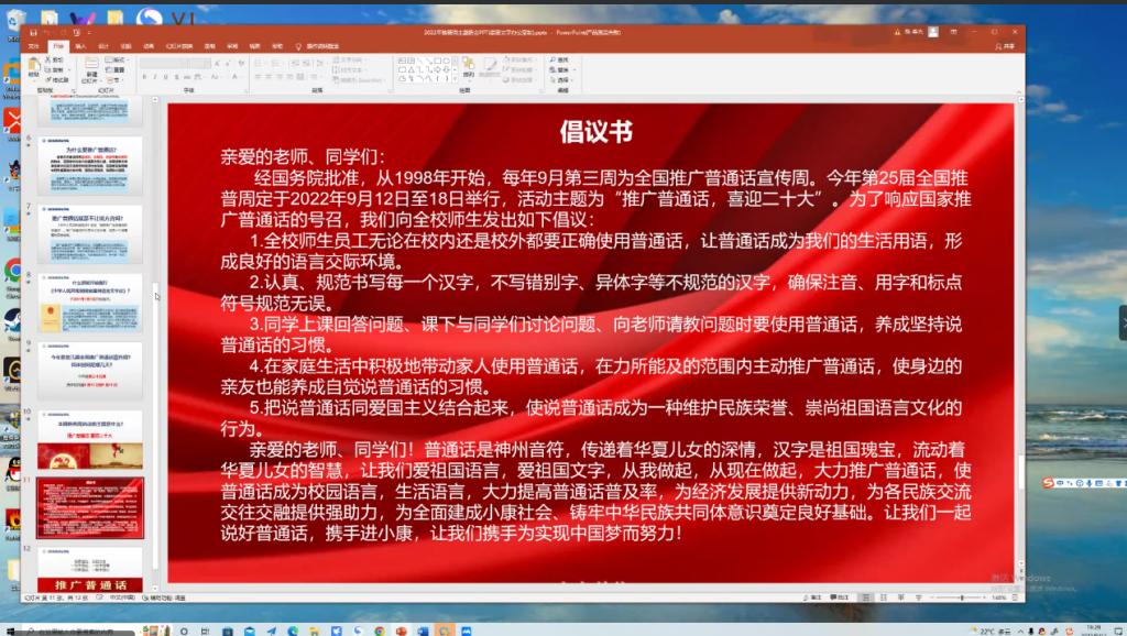 为进一步增强师生对语言文字规范化工作重要性的认识,有效提高广大师生使用普通话和规范字的能力和水平,营造与和谐社会相适应的和谐语言生活氛围,信息学院于9月12日-18日组织全院各班级开展了以“推广普通话 喜迎二十大”为主题的主题班会。