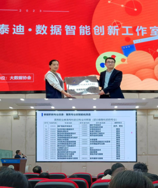 大数据技术的发展与进步离不开学校和企业的共同支持以及资源供给,因此在学校和企业大力支持下,我们成功得创立了泰迪数据智能工作室,这一成果为我们数据型专业后续发展提供极大的助力。信息学院于2023年11月7日在B212举办“大数据引领,创新驱动发展”泰迪数据智能创新授牌仪式。广东泰迪智能科技股份有限公司、四川负责人陈志勇总经理,广东泰迪智能科技股份有限公司-泰迪总部教学部讲师张胤老师,信息学院大数据技术专业、教研室主任马莲老师以及大数据技术专业教研老师王译啡老师共同参与此次泰迪数据智能创新授牌仪式。