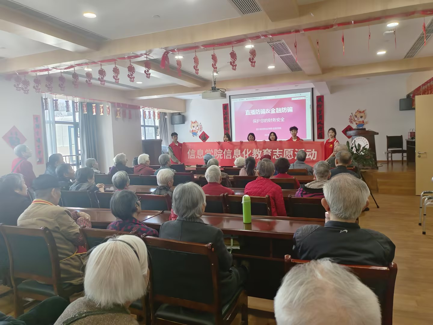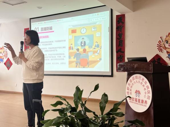 尊老爱幼是中华民族的传统美德,大学生正处在人生观、世界观、价值观的重要形成时期,为了加强对自身的思想培养,在日常生活中养成良好的品格和行为习惯,以及提升老年群体防范识别电信网络诈骗行为的能力和意识,信息学院商务数据分析与应用教研室主任唐雨薇老师、团总支书记王艺霏带领“信”火相传志愿服务队于2024年4月11日赴成都锦欣九九乐慈养老中心开展了一场“AI时代背景下的骗局”主题讲座。