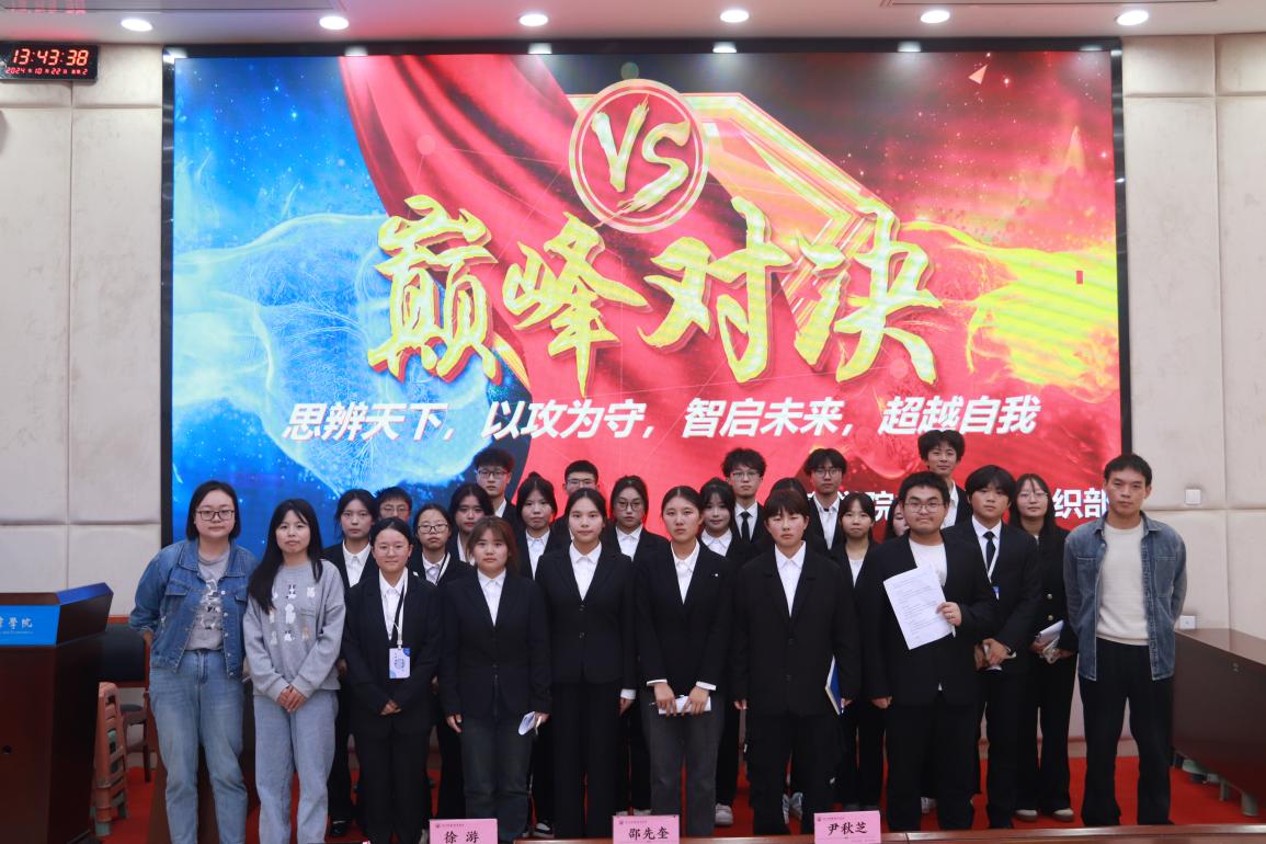 辩是辩非,辩天下公理;论古论今,论人间万象。为丰富学生课余生活,培养逻辑思维能力,张扬自己的个性,活跃校园气氛,让大家感受到辩论赛急中生智的智慧与灵感,信息学院于10月22日在B栋212开展了“巅峰对决”辩论赛活动,本次活动评委由信息学院专职辅导员尹秋芝、邵先奎以及徐游老师组成。